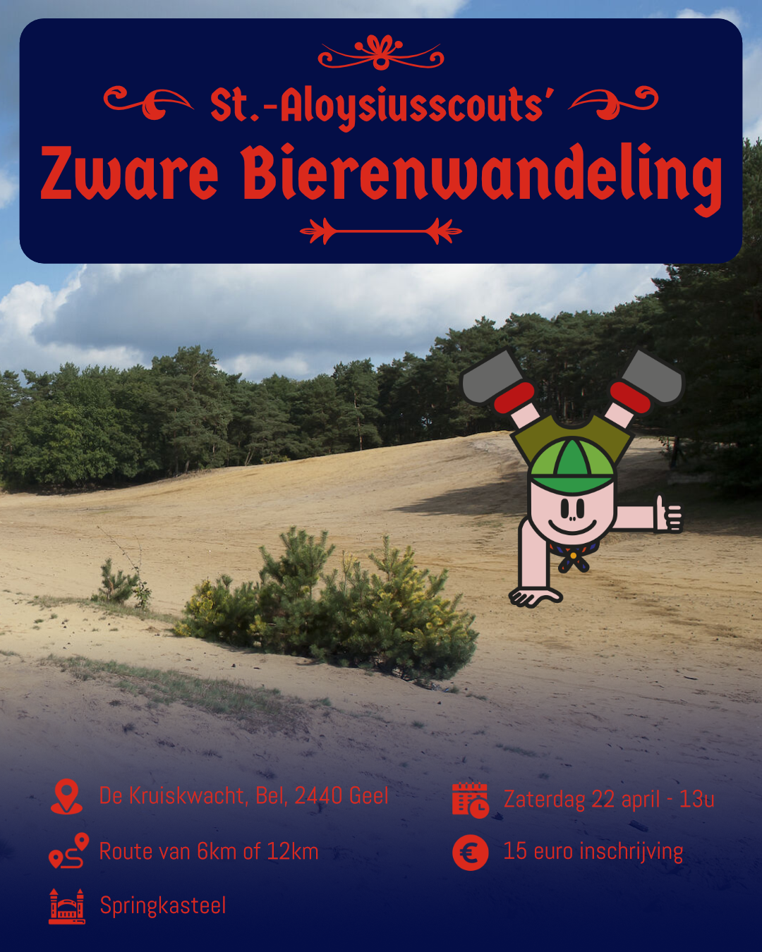€15Na het succes van vorige editie, organiseren we voor een tweede maal onze zware bierenwandeling en dit op 22 april. Een leuke wandeling doorheen de idyllische Belse bossen, voorzien van hapjes en drankjes onderweg.